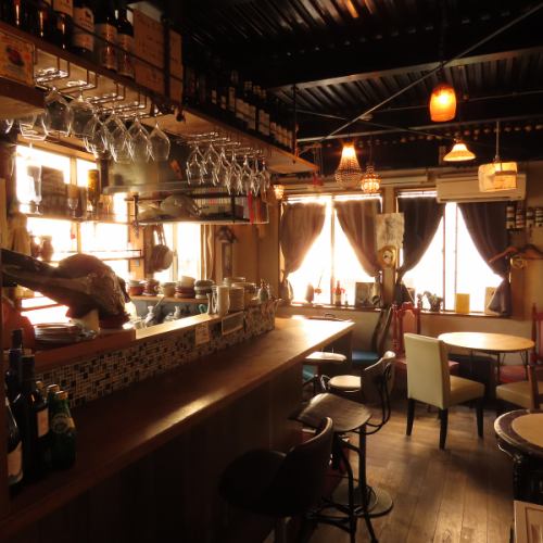 階段をあがると広がる、おしゃれな隠れ家的バル。間接照明がムーディな雰囲気を演出します。